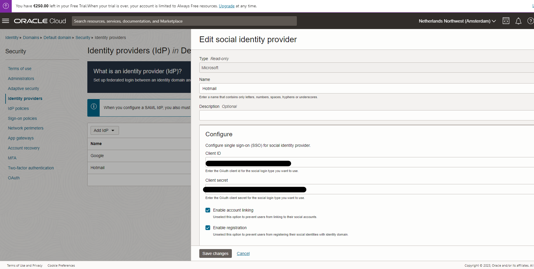 Once we have the client id and secret, it is pretty straight forward to set social sign on ( identify provider) in OCI.