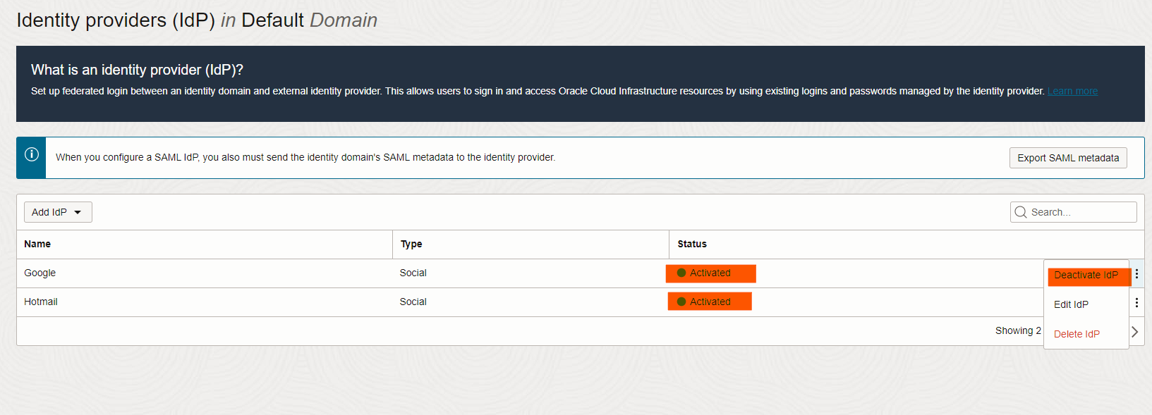 Head to Identify & Security -> Domains, click on your domain ( mine is Default). Once you are in your identify Domain click on Security -> Identity Provider and chose Add Social IdP