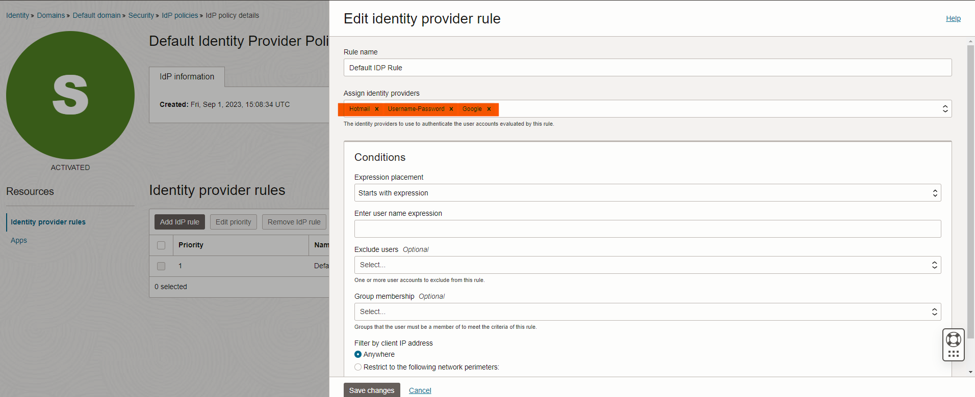 We are almost done, one last step is to add these IdPs we created to IdP policies, so the sign on will start to use it. To do it, head to IdP policies -> Default Identity Policy -> Edit first Rule and add two new identity providers and save changes