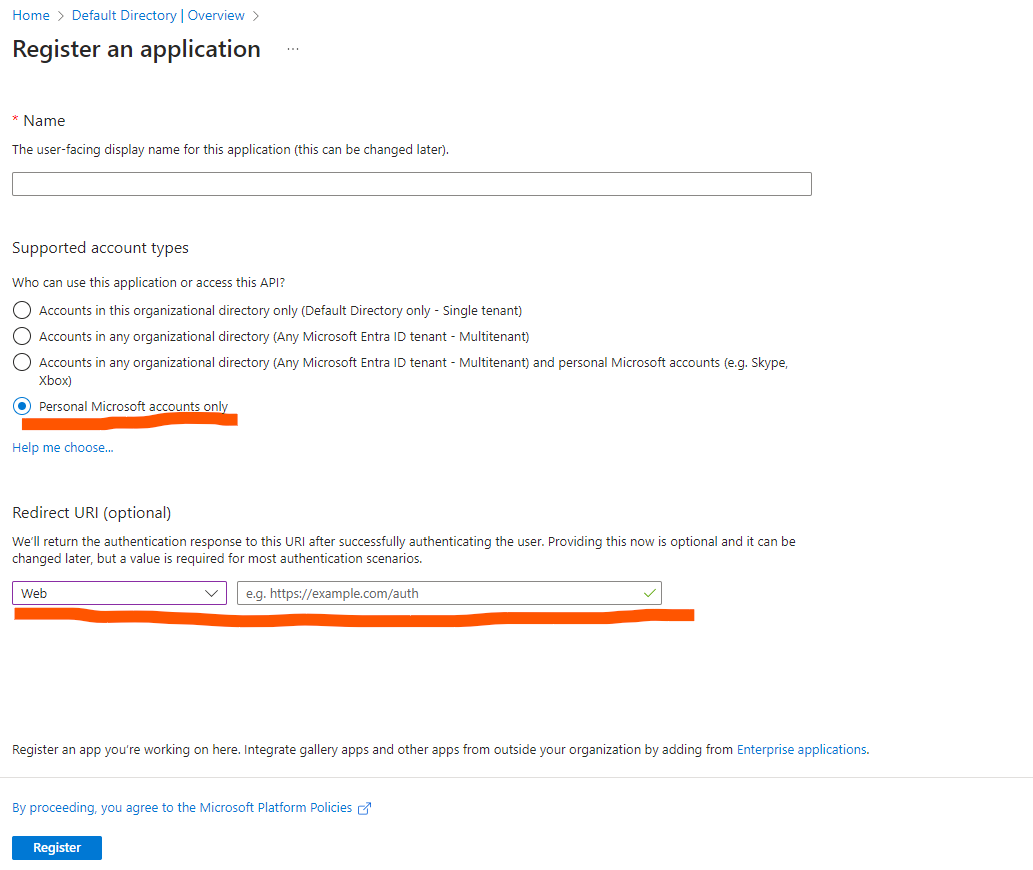 On Registration an application page, choose Personal Microsoft Accounts Only for Support Account Types, and Web for Redirect URI. Redirect URl is a must.