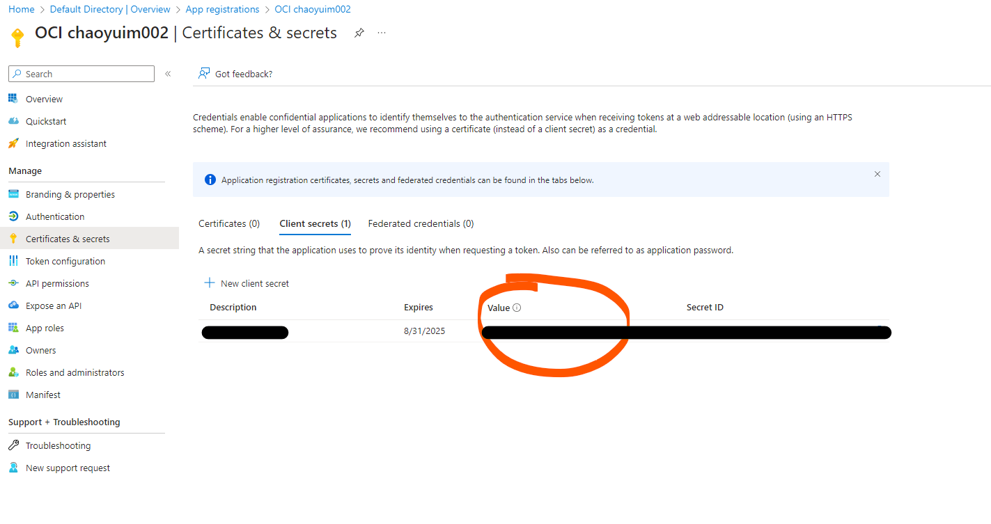 - Client Secret, client secret is created via Client Credential -> New Client Secret. Remeber to copy Value NOT secret ID